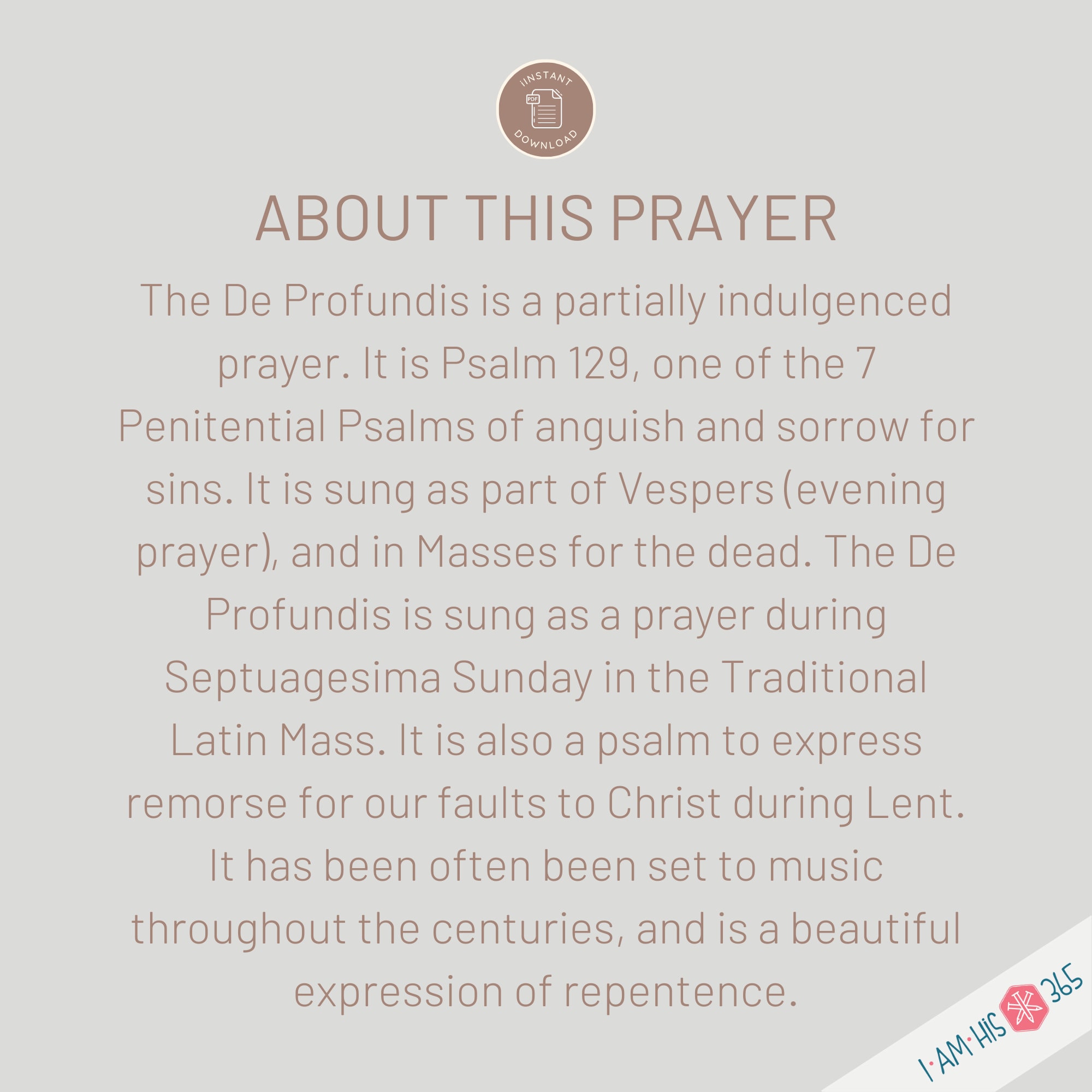 An essential prayer of the Catholic Church, The De Profundis is a partially indulgenced prayer. It is Psalm 129, one of the 7 Penitential Psalms of anguish and sorrow for sins. It is sung as part of Vespers (evening prayer), and in Masses for the dead. The De Profundis is sung as a prayer during Septuagesima Sunday in the Traditional Latin Mass. It is also a psalm to express remorse for our faults to Christ during Lent. It has been often been set to music throughout the centuries, and is a beautiful expression of repentance.