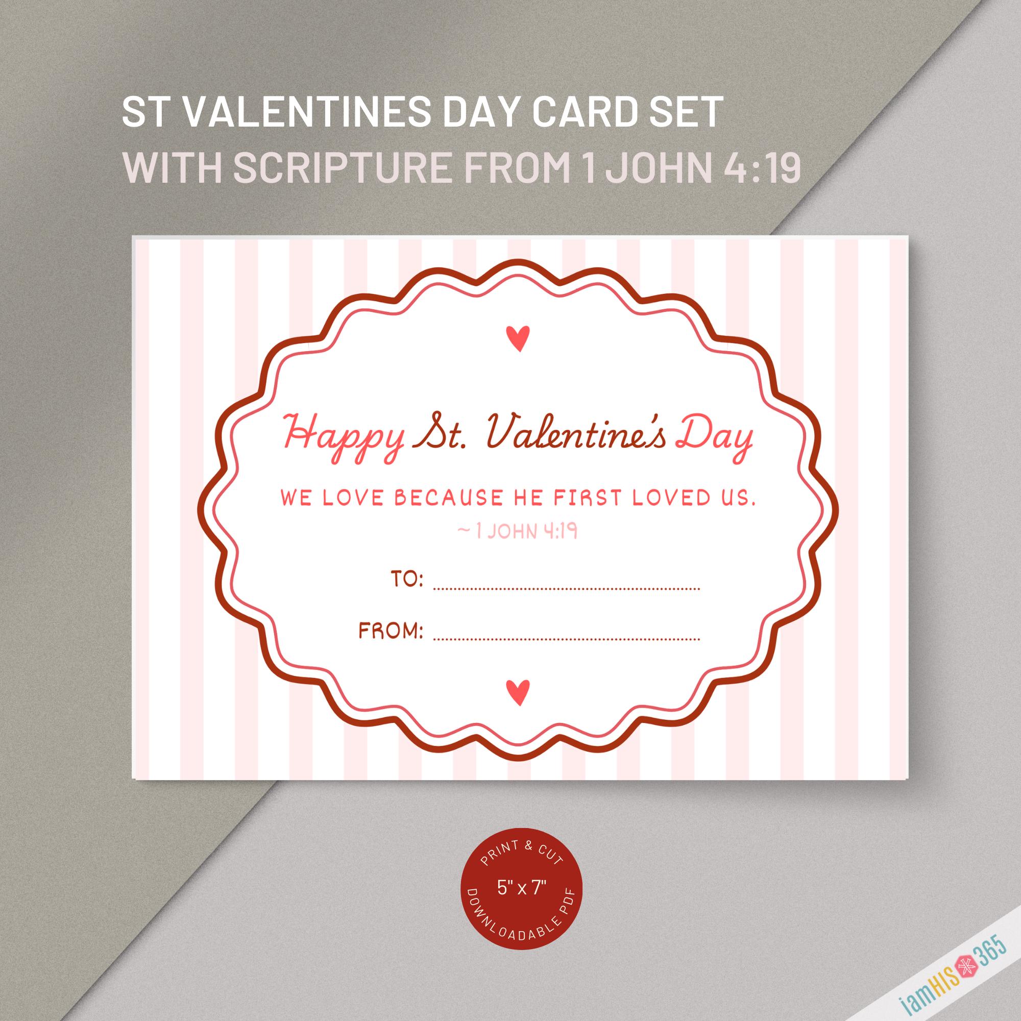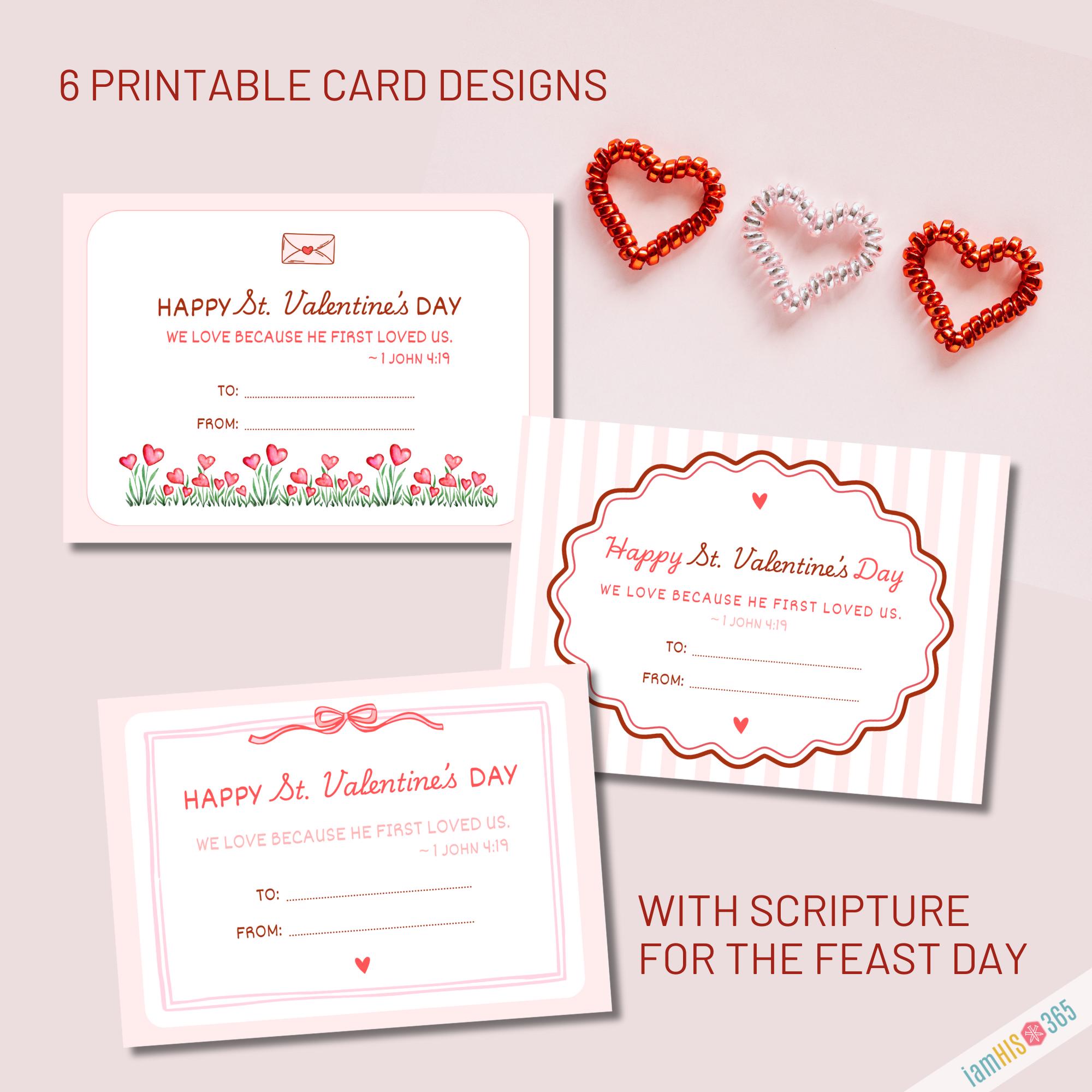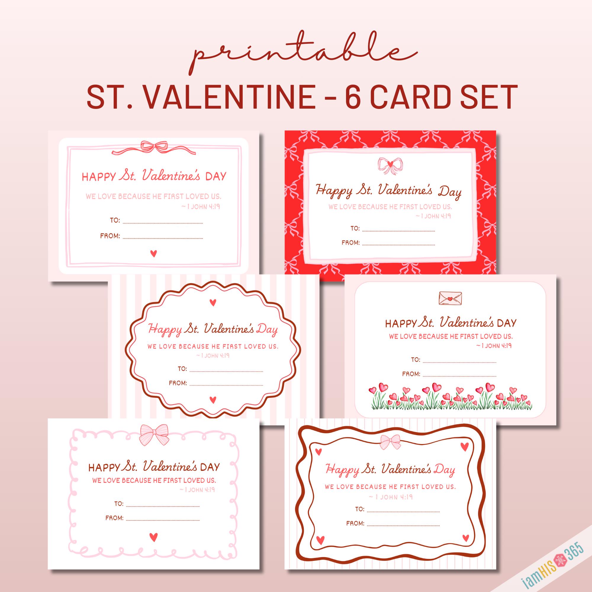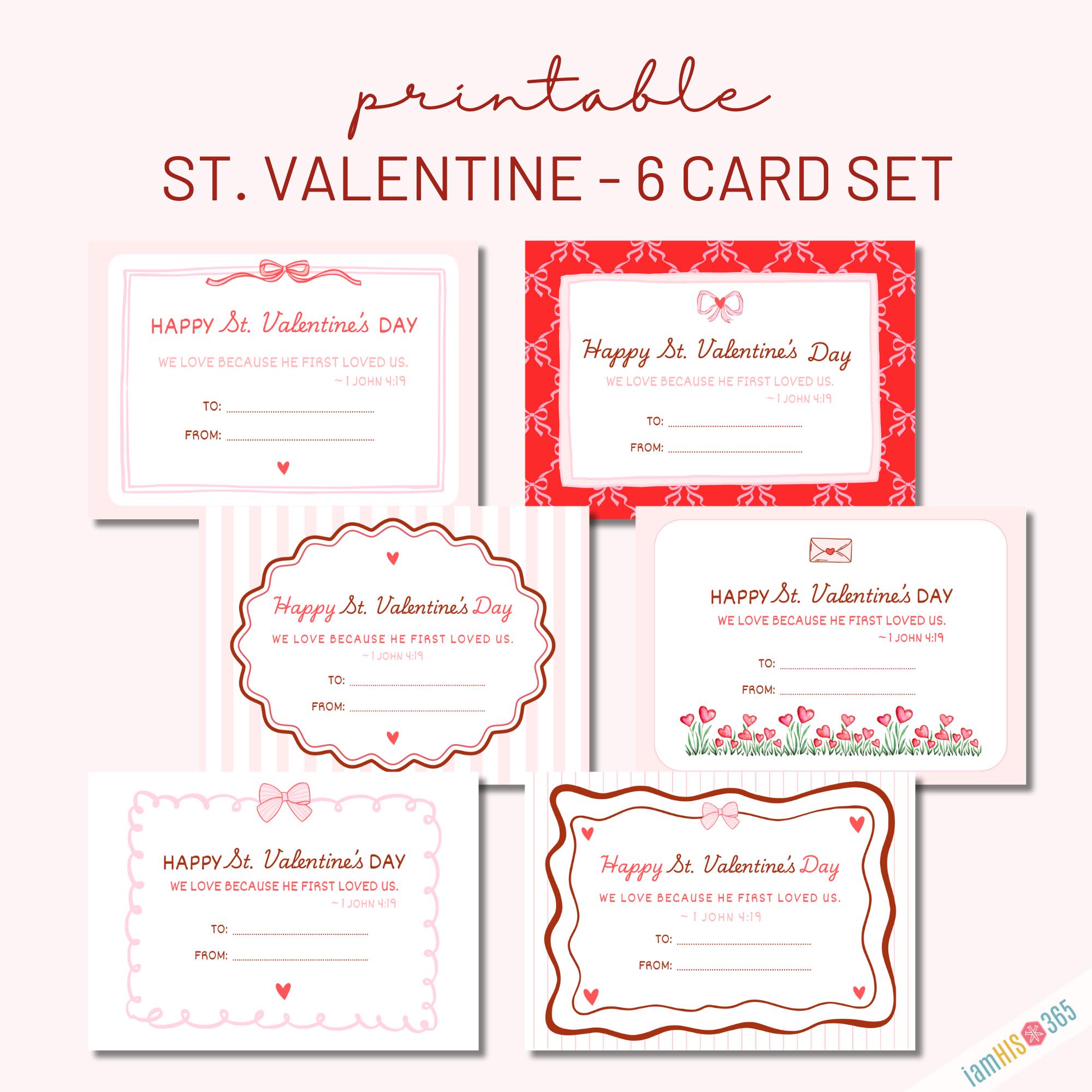 Celebrate the Feast Day of St. Valentine (February 14) with this beautifully designed Catholic Valentine printable. This instant‑download PDF includes 6 printable St. Valentine cards, each featuring a simple Scripture verse on love from 1 John 4:19 — “We love because He first loved us.”