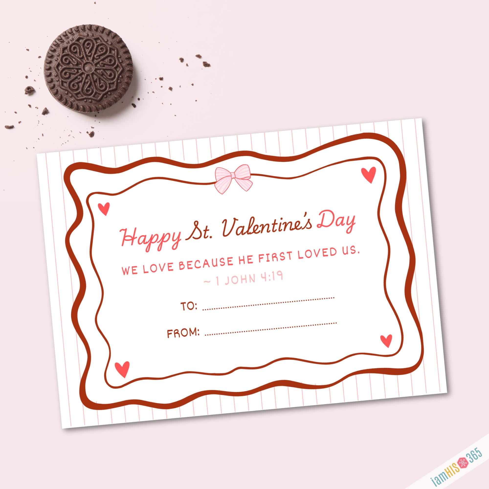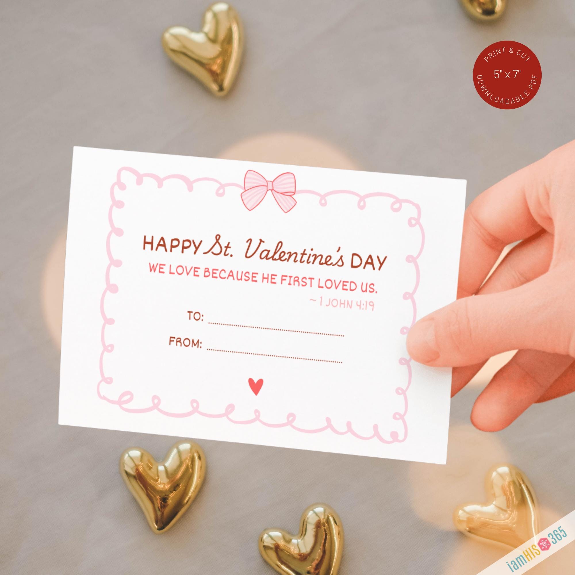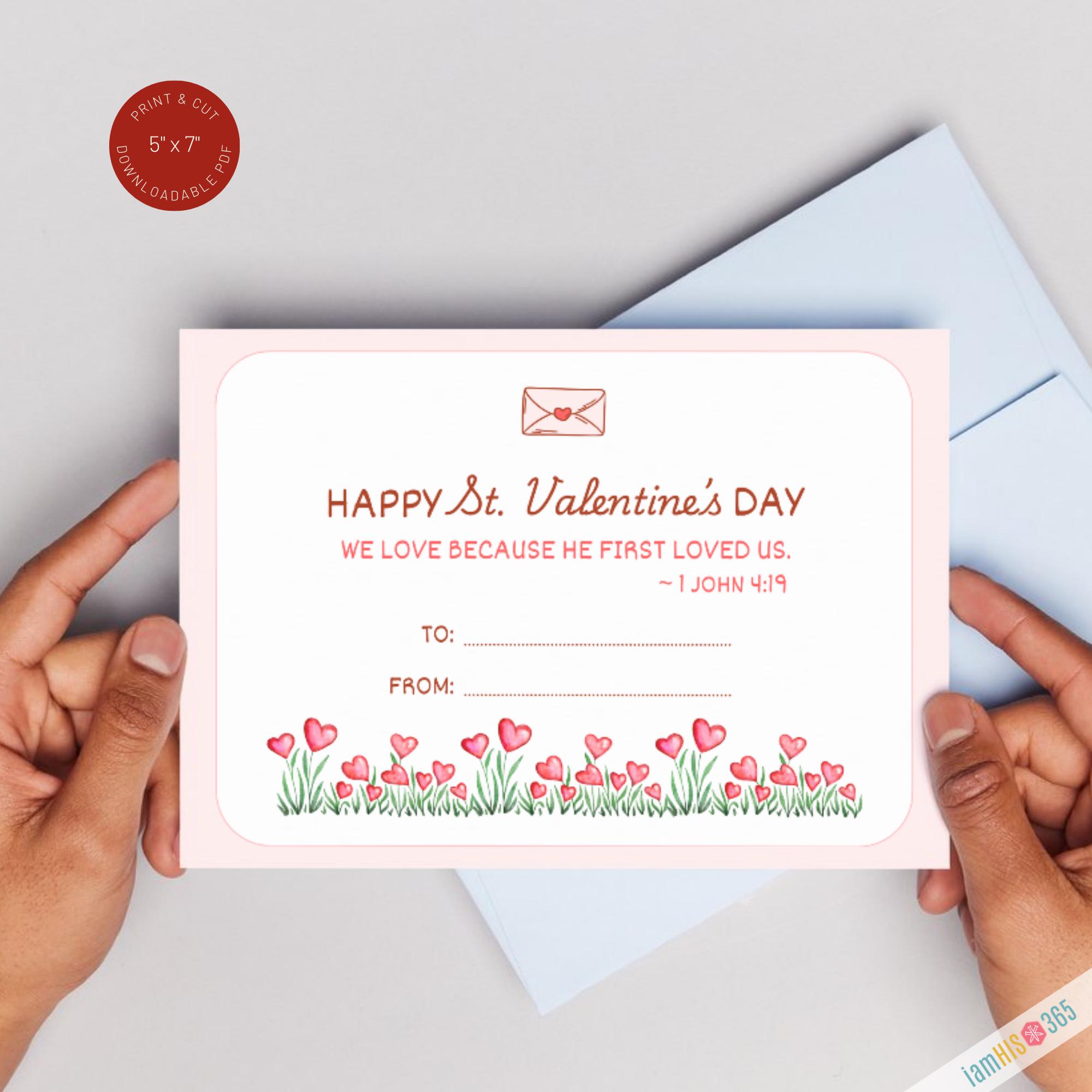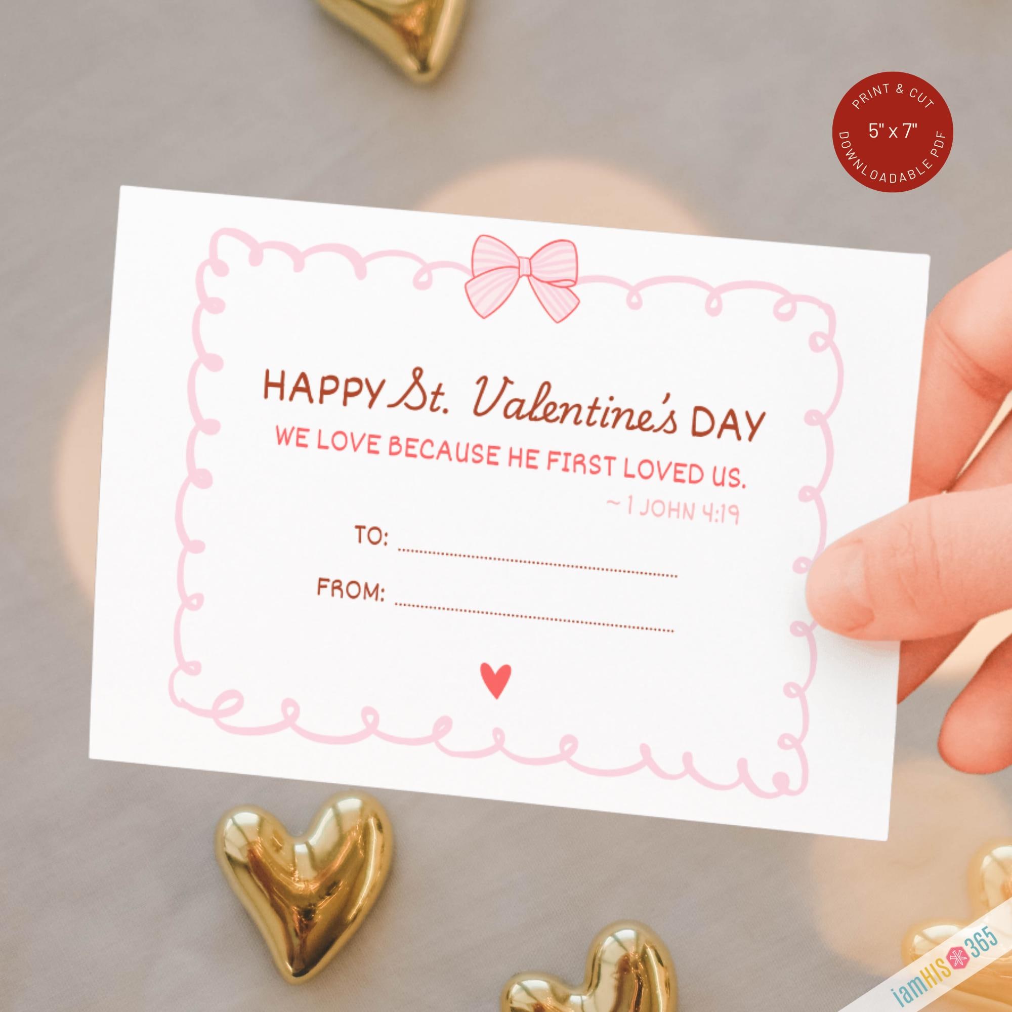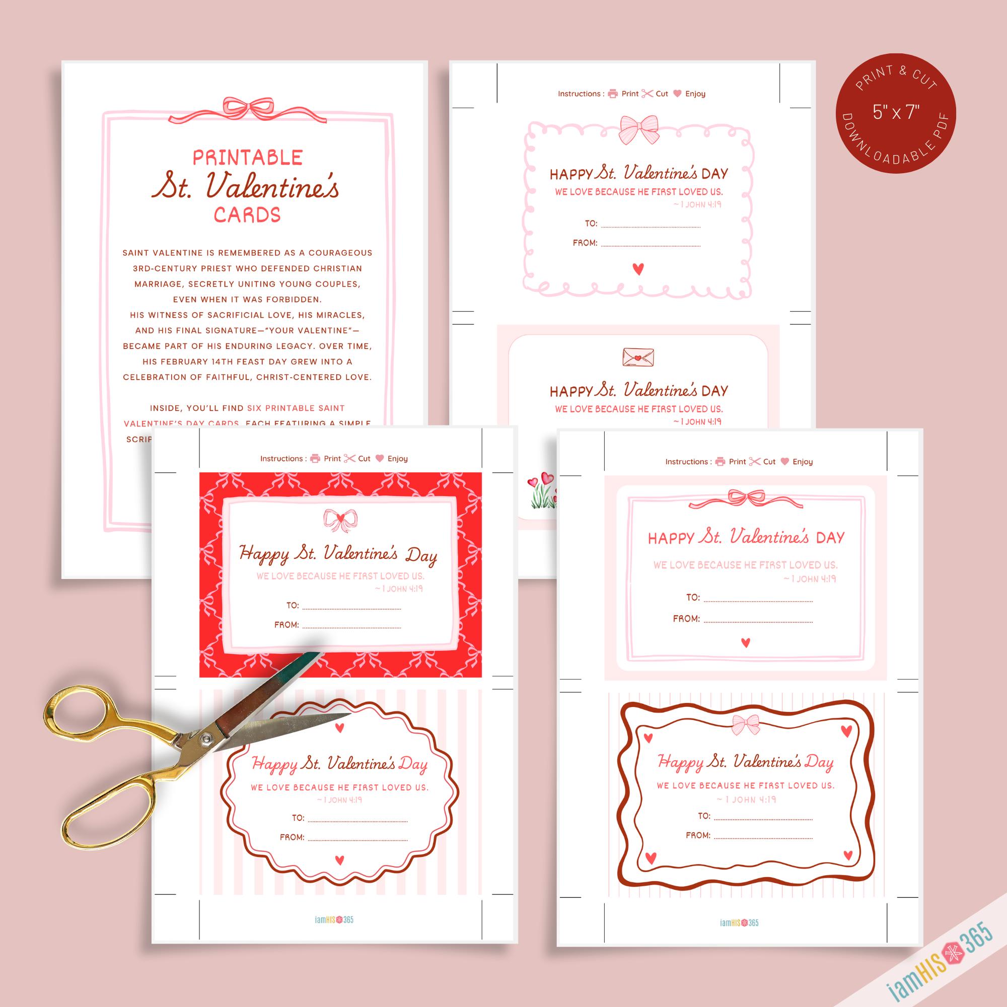 Celebrate the Feast Day of St. Valentine (February 14) with this beautifully designed Catholic Valentine printable. This instant‑download PDF includes 6 printable St. Valentine cards, each featuring a simple Scripture verse on love from 1 John 4:19 — “We love because He first loved us.”