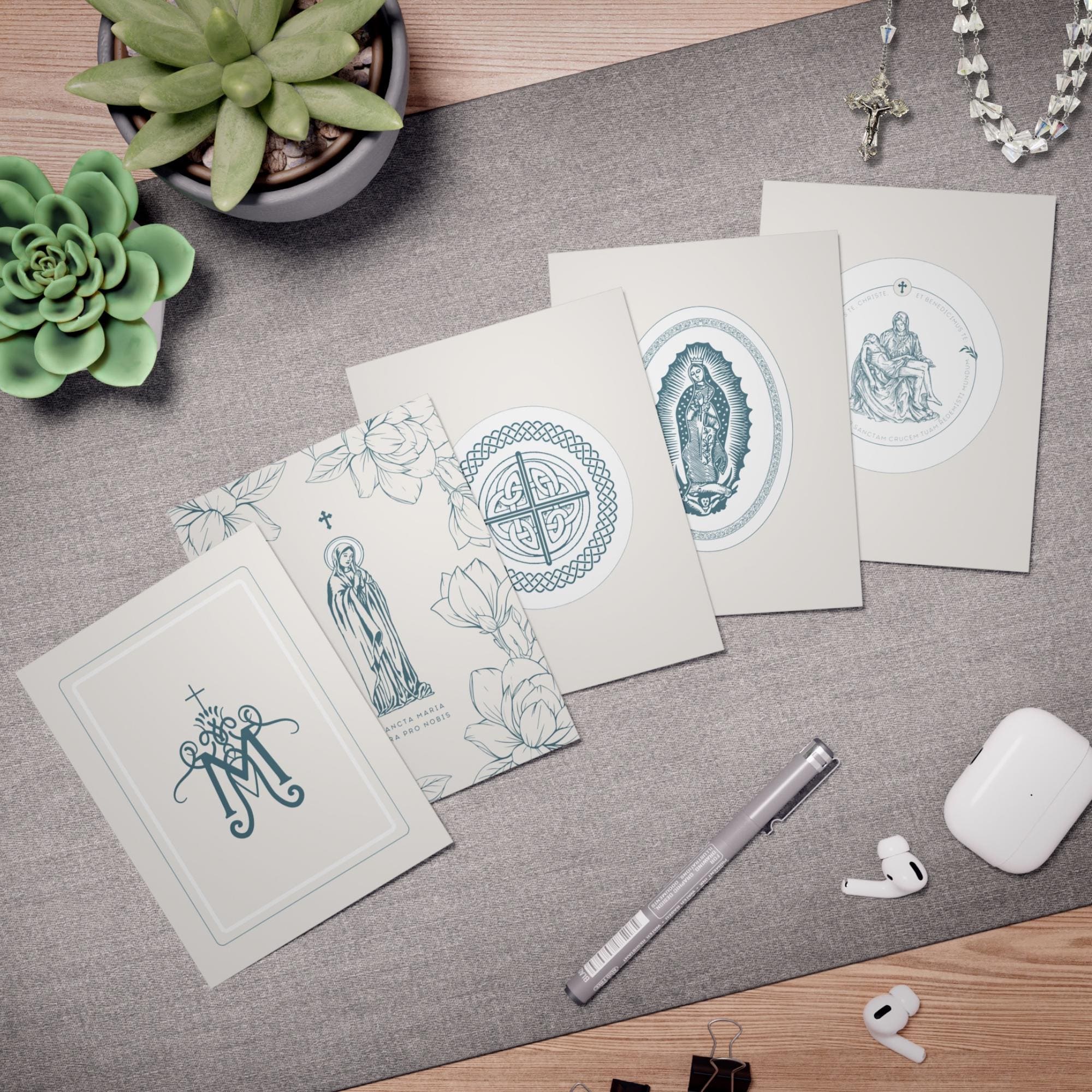 Each 4.25" x 5.5" card, with envelopes included, is designed with classic devotional Catholic motifs for devotion.