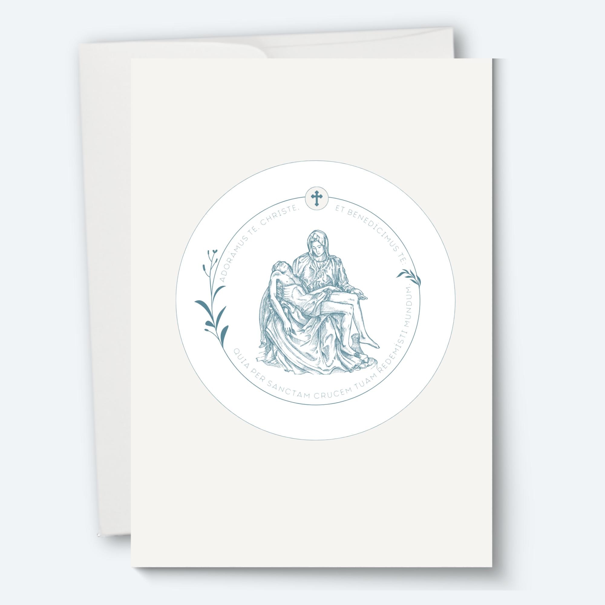* The Pieta design card subtly features a short Latin prayer inscription that reads : ADORÁMUS Te, Christe, et benedícimus te: Quia per sanctam Crucem tuam redemísti mundum, which translates to "We adore you, Christ, and we bless you: Because by Thy Holy Cross you redeemed the world."