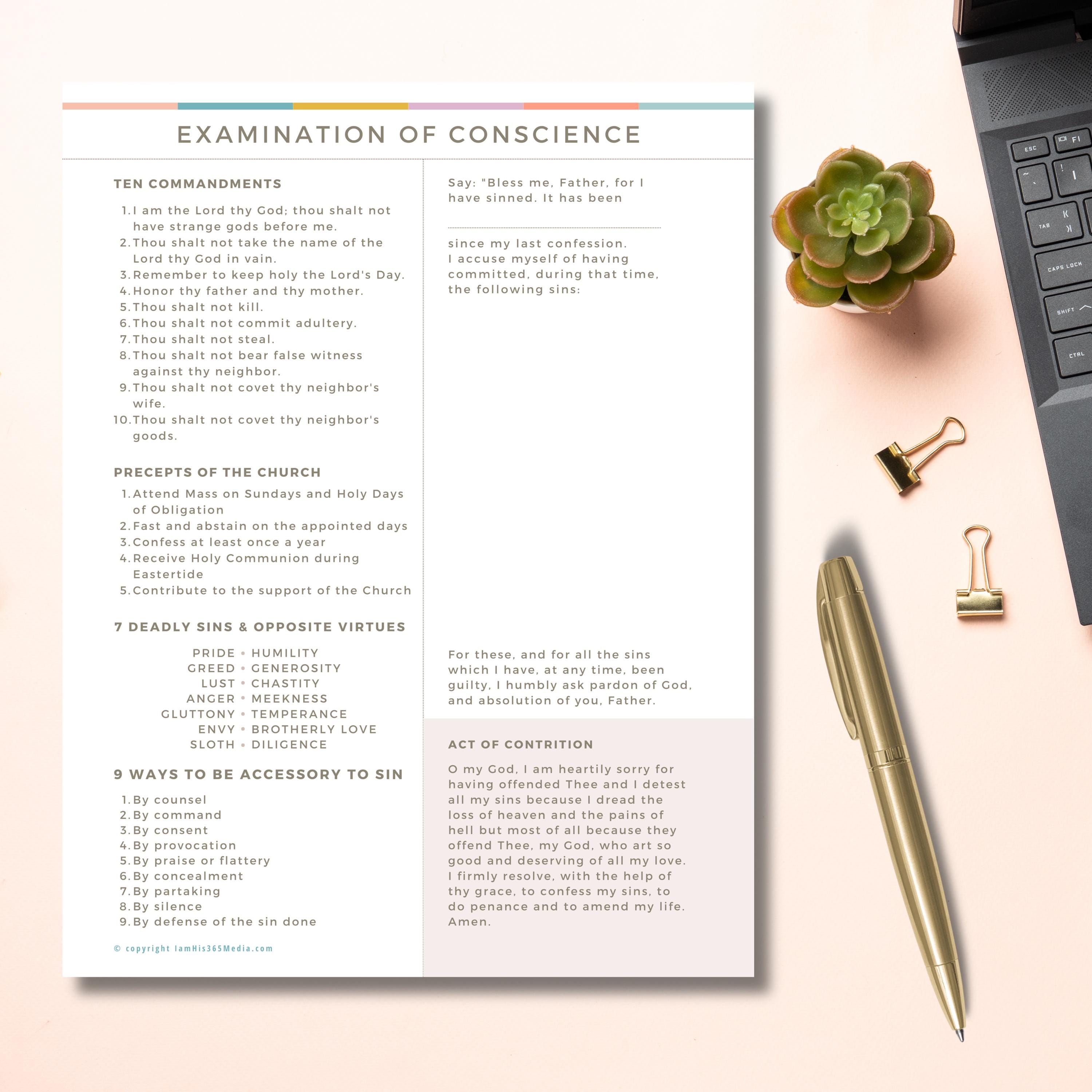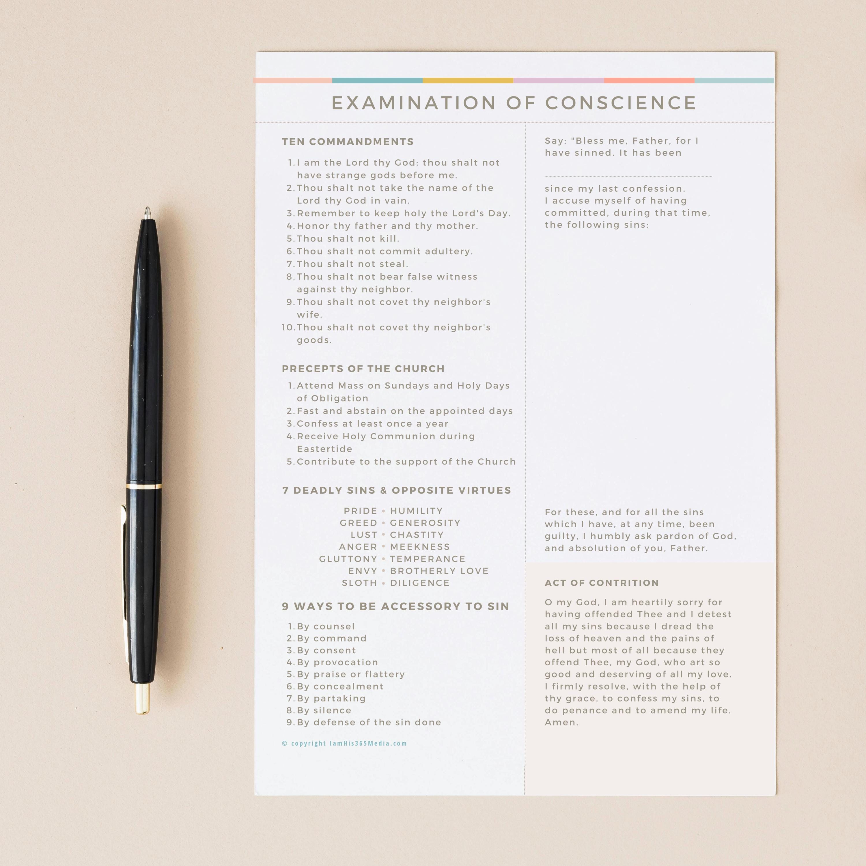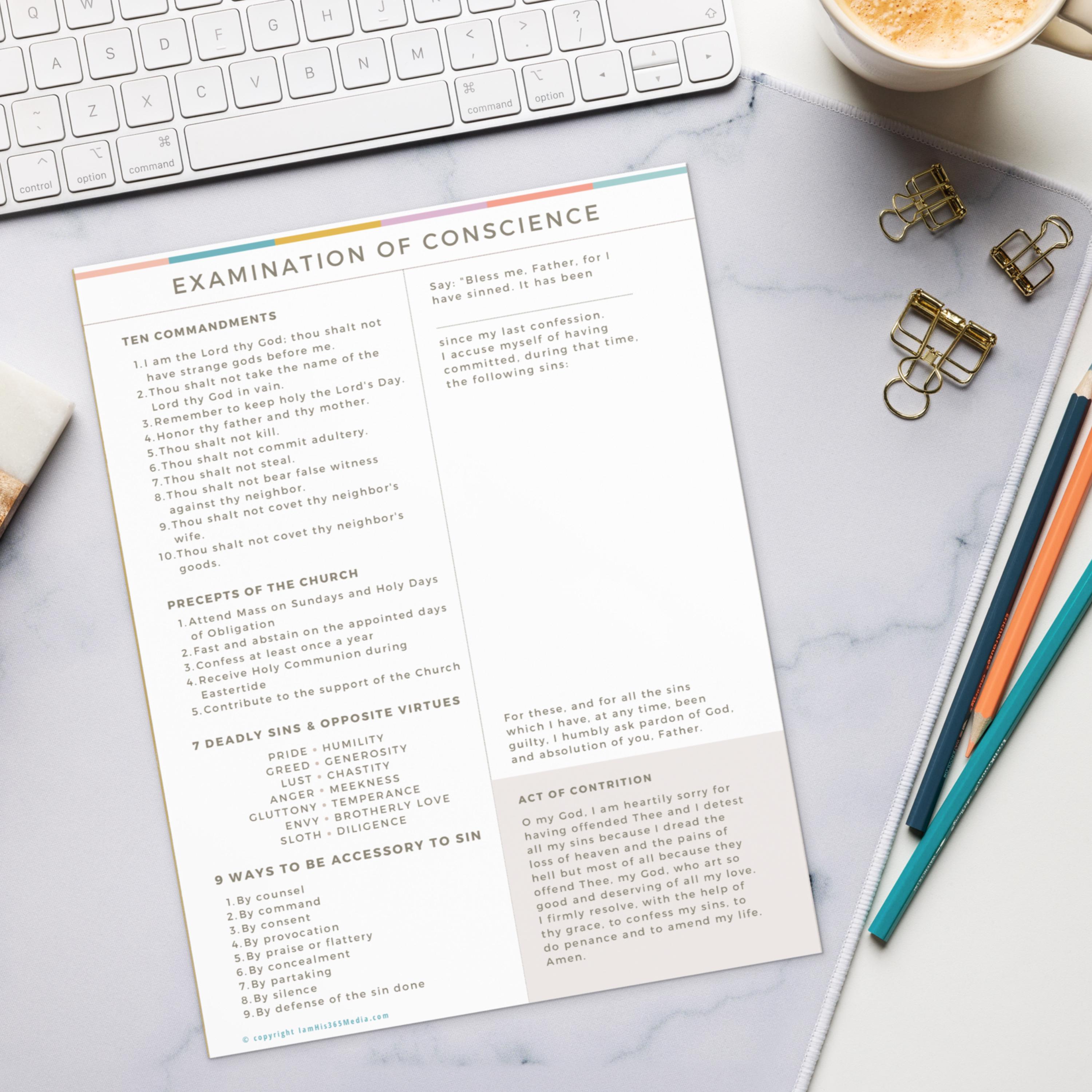 The traditional Act of Contrition is also included on the sheet so that you have everything you need to prepare for and make a good confession.