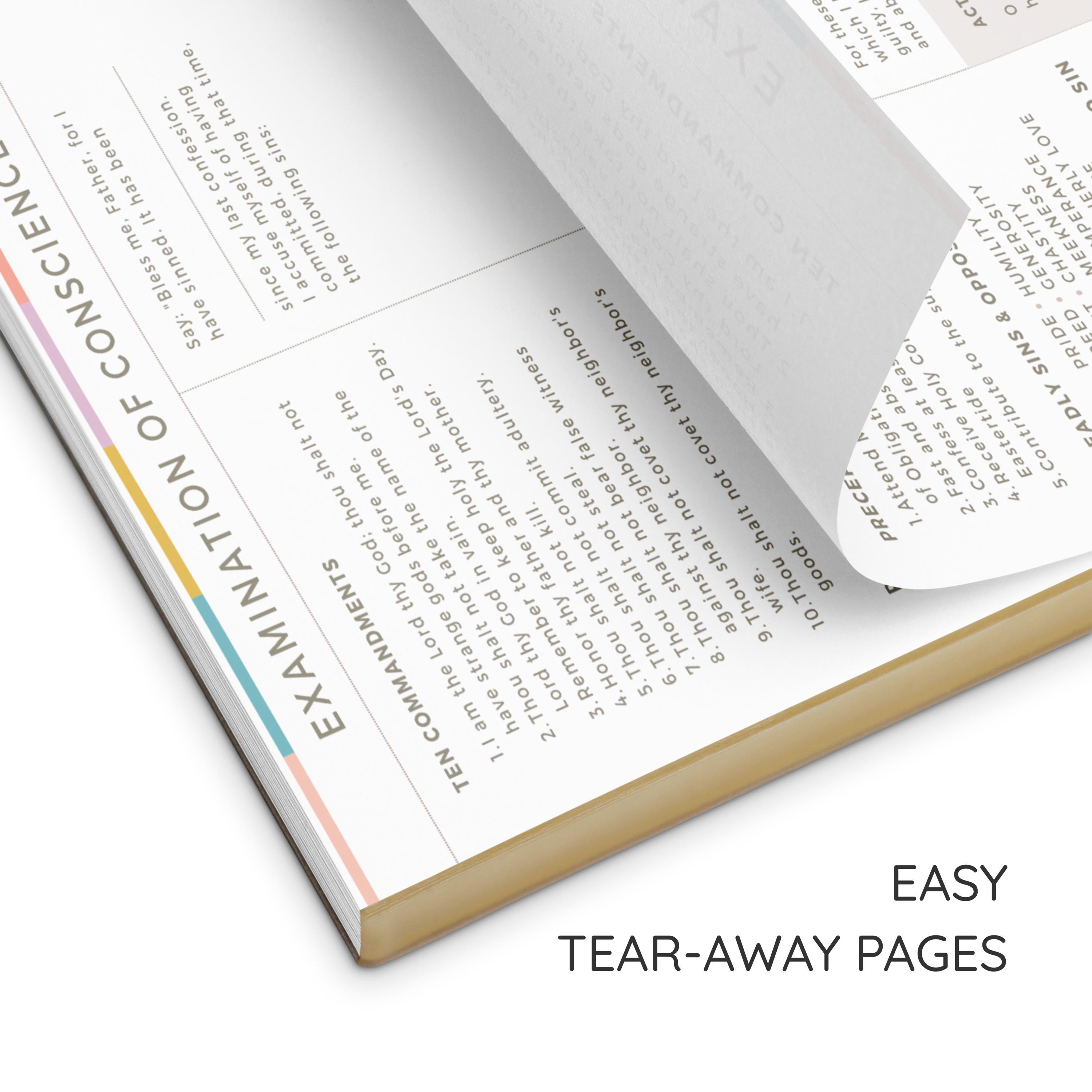 Each sheet provides a guided Examination of Conscience with space to write, helping you prayerfully review your actions before going to confession. When you are ready, simply tear off the page and bring it with you to the confessional.