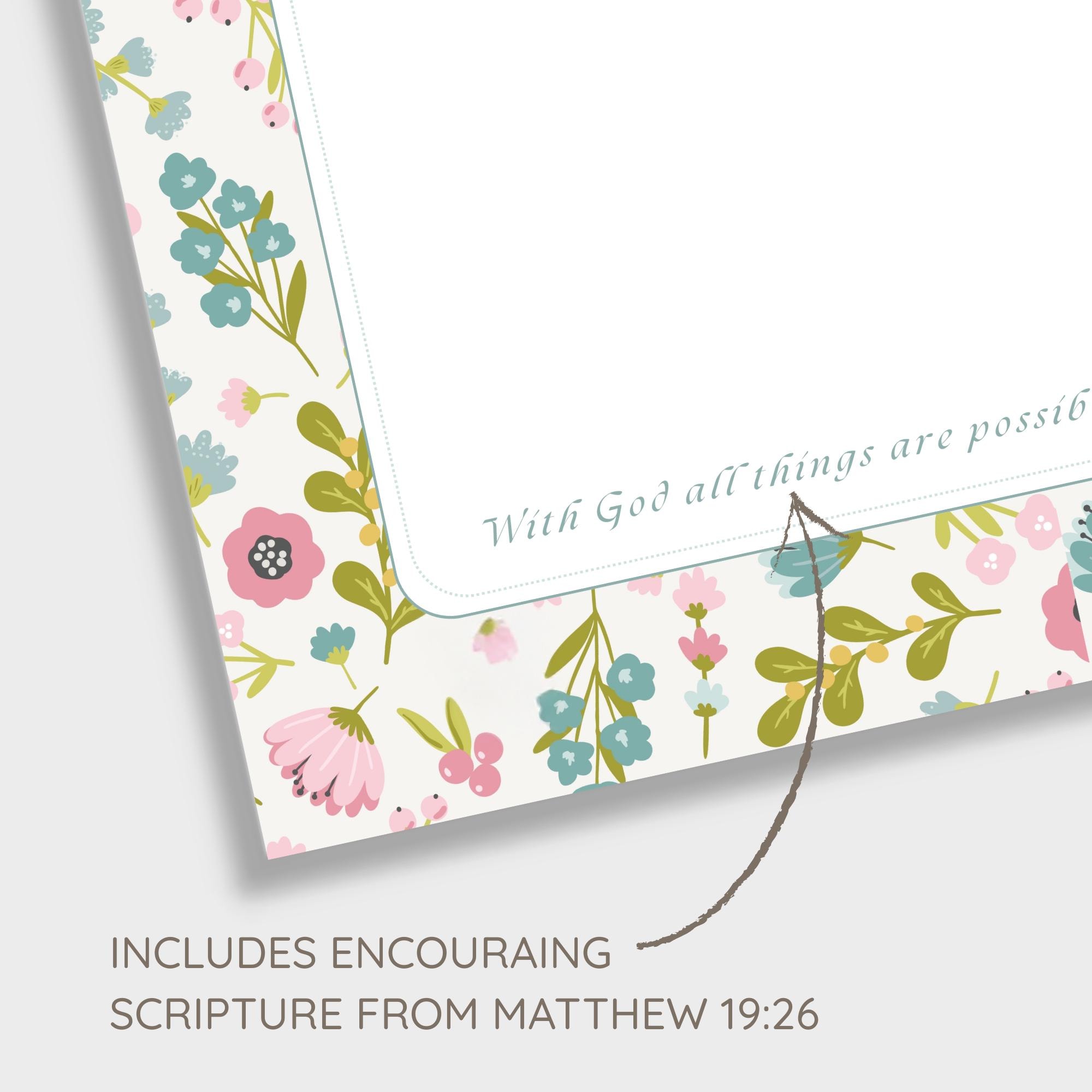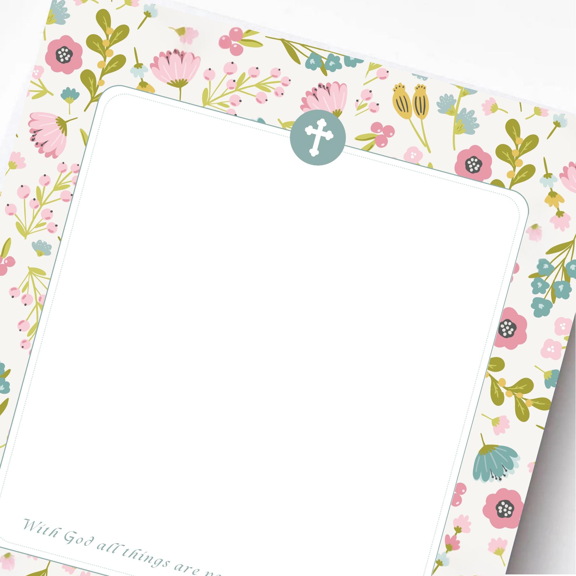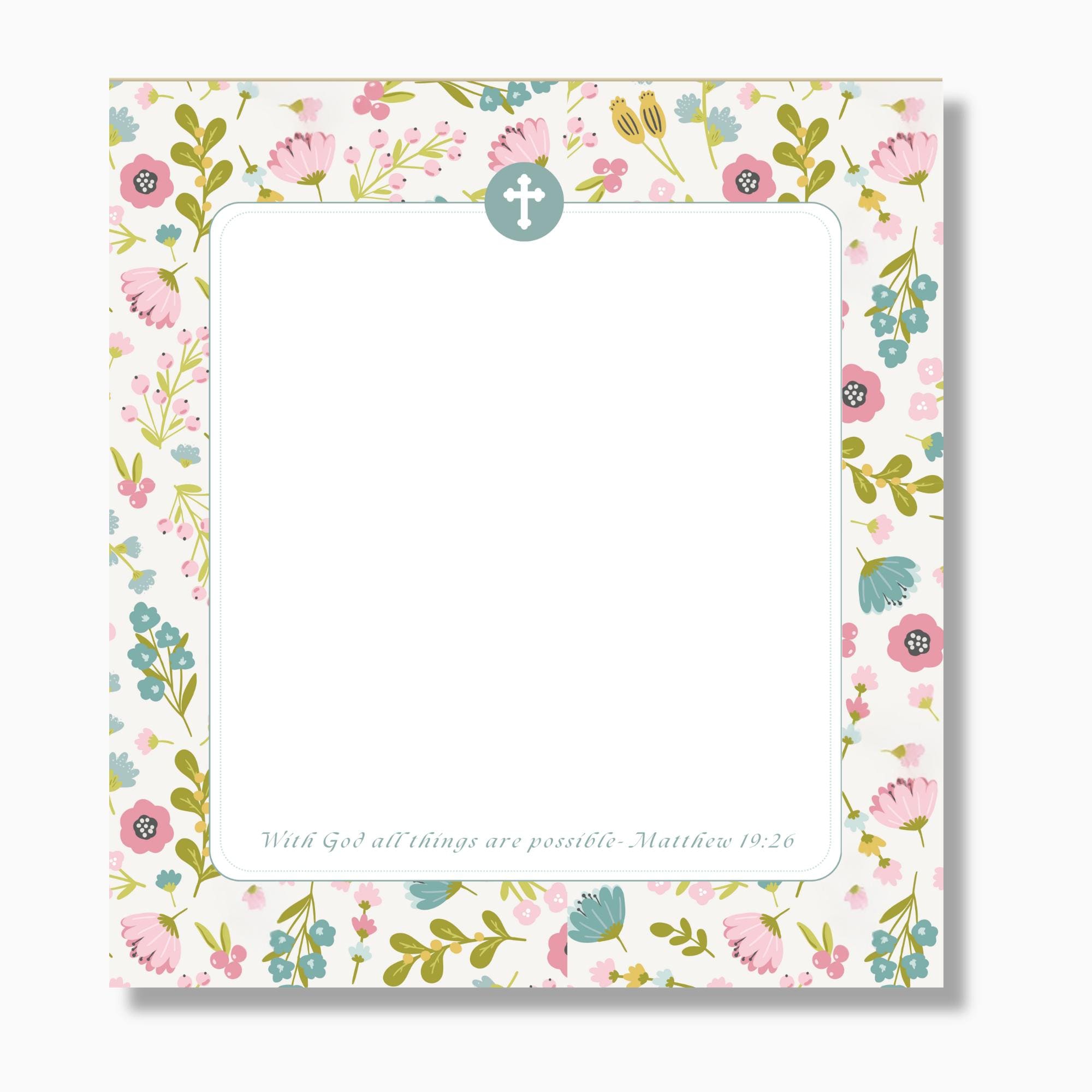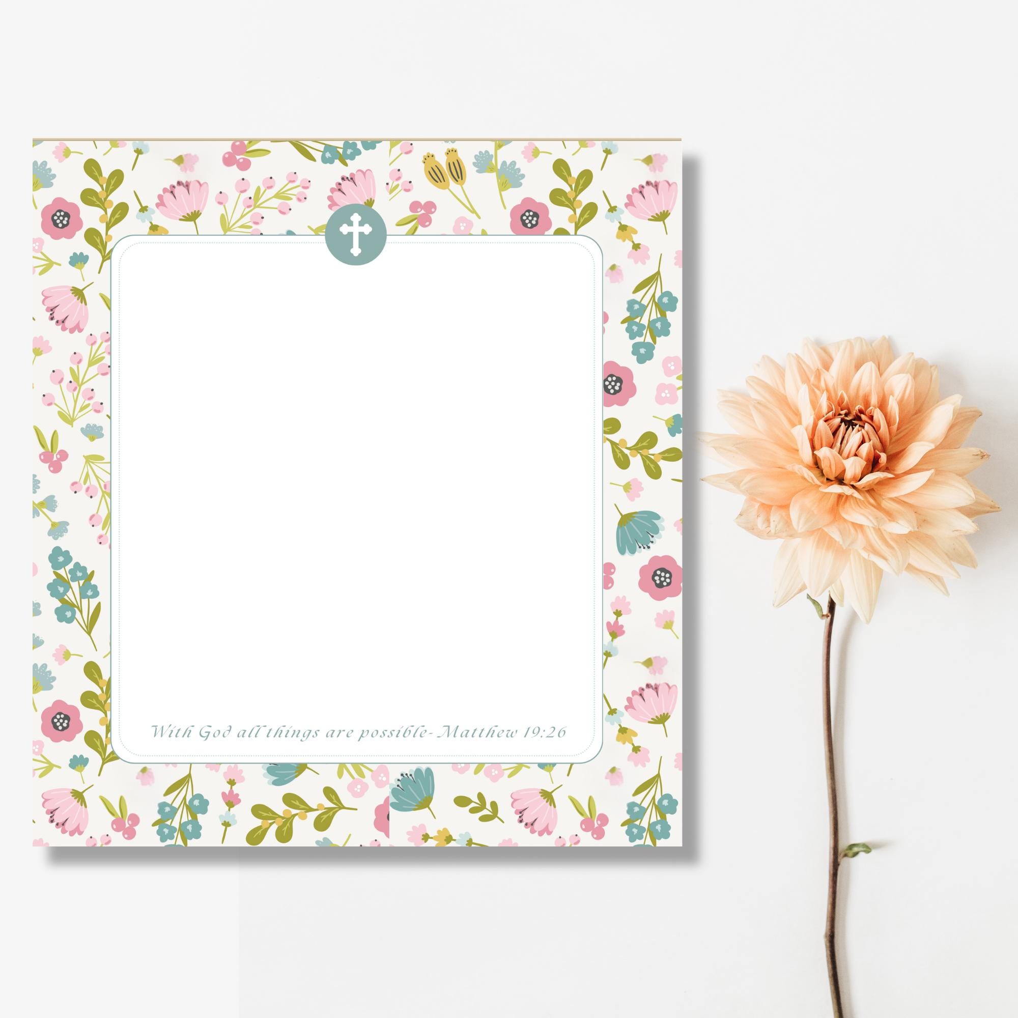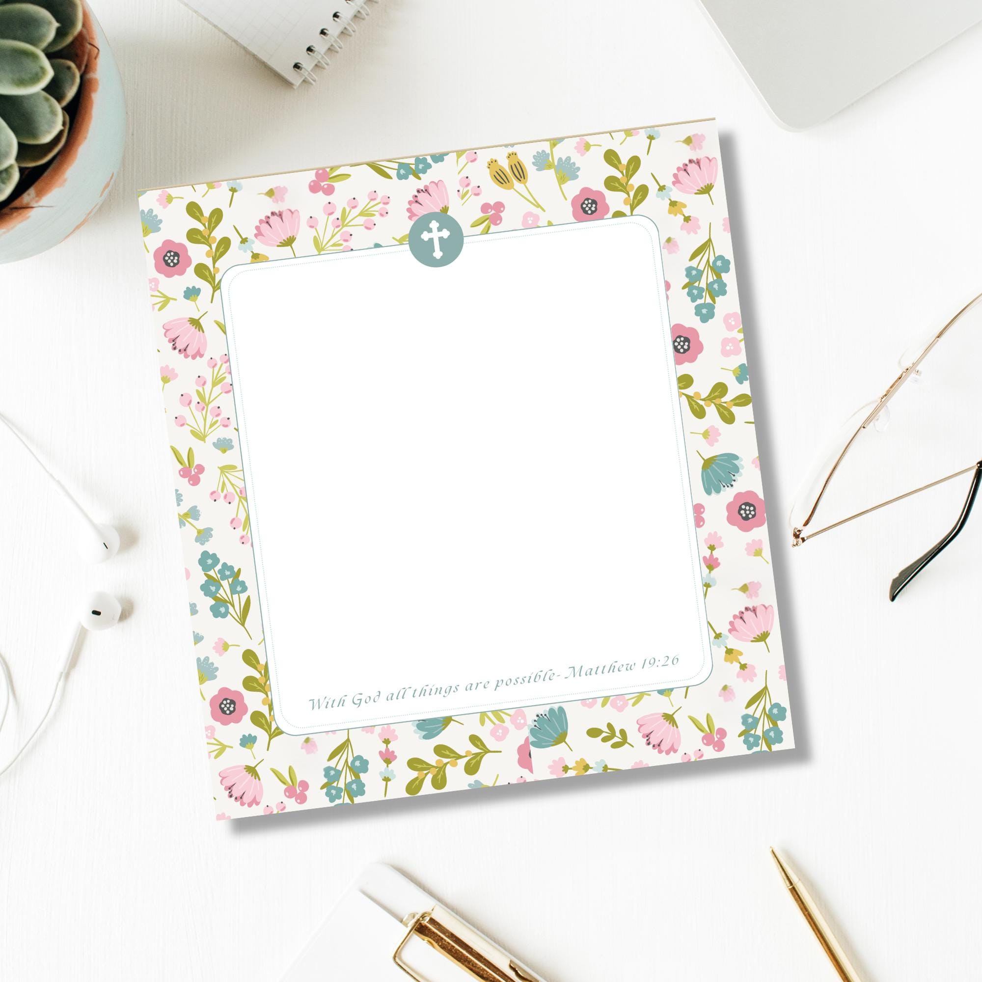 Bring a touch of peace to your prayer space with this simple, beautifully designed notepad. Each sheet features a soft floral border in calming tones, a small cross icon at the top, and the Scripture verse from the Douay‑Rheims Bible: “With God all things are possible — Matthew 19:26.”